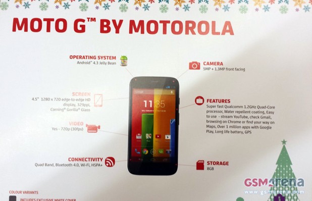 A tengernyi színben és különböző színű burkolatokkal is rendelhető Moto X után az amerikai gyártó rövidesen egy újabb mobillal is előrukkol majd, mely a 215 dolláros árával igen vonzó ajánlatnak tűnik. Az Android 4.3 Jelly Bean alapokon nyugvó készülék egy idő előtt kiszivárgott plakát alapján 4,3 hüvelykes HD kijelzőt, 5 megapixeles fő és 1,3 megapixeles előlapi kamerát, 1,2 GHz-es négymagos Qualcomm processzort, valamint 8 GB belső tárhelyet kapott. A készülék az Egyesült Királyságban még az év vége előtt piacra kerül, ám egyelőre nem tudni, hogy más régiókban mikortól lesz elérhető.