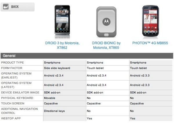 A Motorola hivatalos fejlesztői oldalán bukkant fel a régóta pletykált Bionic teljes specifikációja, mely az előzetes információknak megfelelően igencsak erősre sikeredett. Az 1 GHz-en futó kétmagos Texas Instruments OMAP 4430 processzor köré épülő eszköz 4,3 hüvelykes, 540x960 képpontos kapacitív multitouch érintőkijelzőt, 1080p felbontású HD anyagok rögzítésére alkalmas8 megapixeles fő és VGA előlapi kamerát, LTE adatátviteli képességet, 1 GB RAM-ot és HDMI kimenetet is kapott. Az Android 2.3.4 alapokon nyugvó Motorola Bionic XT865 esetleges GSM változatának létezéséről egyelőre nincs információ.