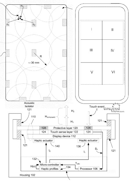 Míg a legtöbb érintőkijelzős készülék hangjelzésekkel és finom rezgésekkel is képes visszaigazolni az érintéseket, addig az Apple valamiért mindig is mostohán kezelte ezt a funkciót. Nem elképzelhetetlen ugyanakkor, hogy a következő generációs készülékekben már lesz kitapintható visszajelzés, de természetesen itt sem a szokásos egyszerű megoldásra kell gondolni. Az Apple legújabb szabadalmi beadványa egy olyan „Multi Haptics” megoldás működését írja le, mely a kijelző és a készülékház különböző régióit külön-külön tudja rezegtetni, vagyis a különböző műveletek visszaigazolása teljesen eltérő lehet. Jó kérdés persze, hogy a gyakorlatban mennyire üzemel a szegmensenként eltérő vezérlés, hiszen a fém készülékház és az üveglap is jól vezeti a rezgéseket, vagyis közel sem biztos, hogy ilyen kis felületen kitapintható lesz a végeredmény.