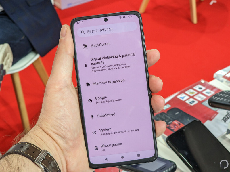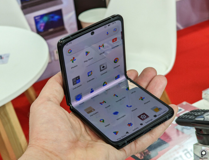 Azért a 12/256 GB-os kiszerelés elég jól hangzik, a 6,67"-es FHD AMOLED panel pedig kirobbanó színekkel teszi a dolgát, a Galaxy Z Fliphez hasonló, jól látható hajlításmintával. Ugyan az MWC-n kiállított prototípus nem végleges, a zsanér jó minőségűnek tűnik, bár marad az összecsukás után középen rés.