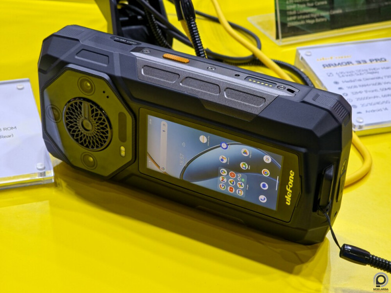 A következő telefon a sorban az Armor 33 Pro és itt már 25 500 mAh-s a telep, ami nem csak a 6,95"-es és 120 Hz-es előlapi panelt látja el energiával, hanem a hátlapi, 3,4"-eset és a 118 dB-es hangszórót. 50, 50, 64: ez a normál, az ultraszéles és az éjjellátó kamera felbontása, nagy adagot rendelhetett a kombinációból az Ulefone.