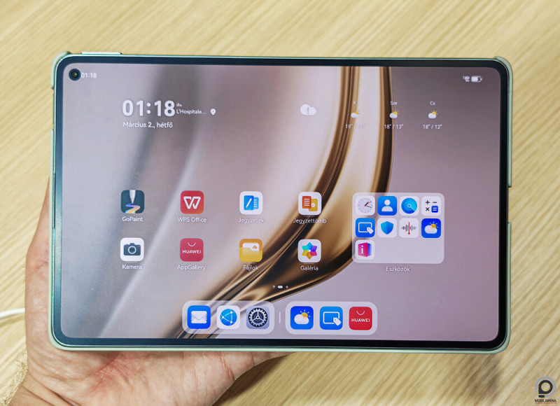 Szeret a Huawei a formával és méretekkel kísérletezgetni, és így született meg az a furcsán tömzsi formájú hajlítható, ami kézbe fogva azonnal elnyerte tetszésemet, csak sajnos a Pura X első generációja nem érkezett Európába. Nem úgy a MatePad Mini, amit ugyan nem érdemes félbehajtani, mert hagyományos táblagép, viszont lazán elfér a farzsebben a támogatott stylusszal egyetemben.