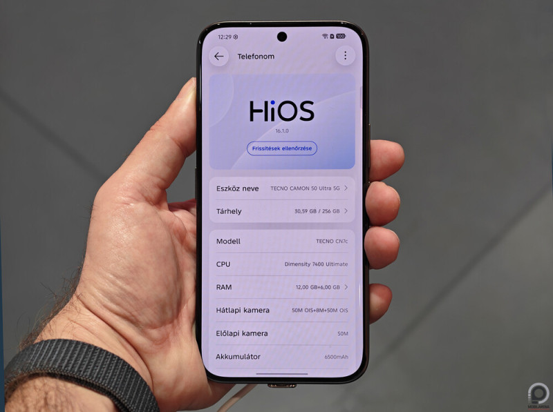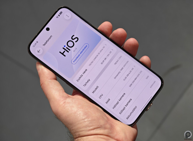 2026-os divatot követve a Camon 50 Ultra hatalmas, 6500 mAh-s telepet pakolt mindössze 178 grammos házba, amely 162,4 x 77 x 7,4 milliméteren kecsesen foglalt helyet a tenyeremben, és még magyar menüt is találtam rajta, ami persze nem garancia a hazai bevezetésre, csak bizonyíték, hogy a szoftvert lefordították és készen áll a disznóvágás lefilmezésére.