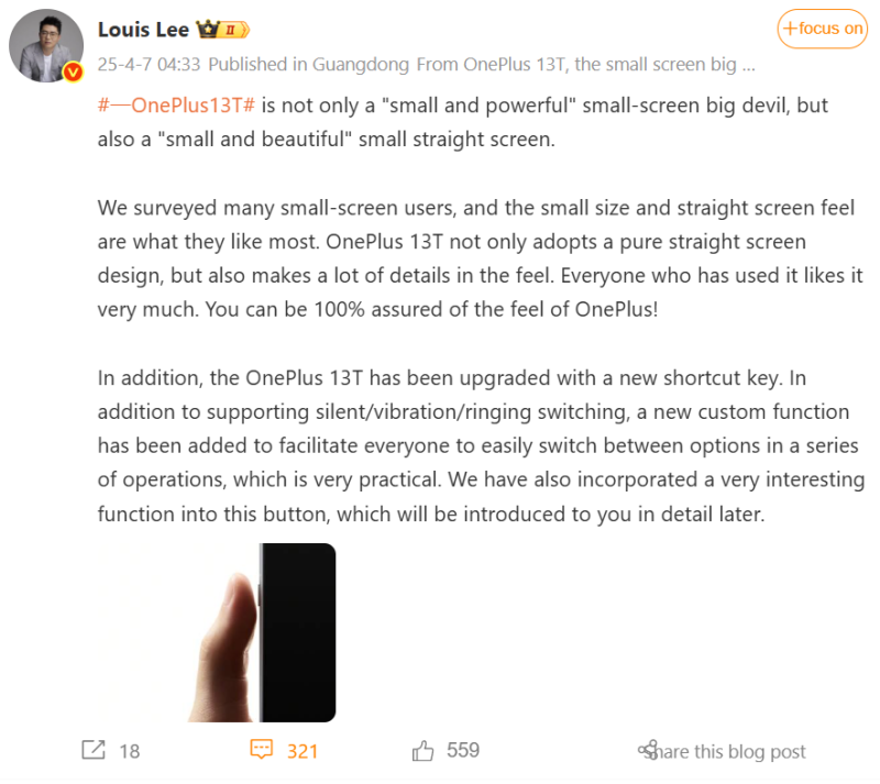 Louis Lee nem győzi hangsúlyozni a legújabb Weibo postban, hogy a OnePlus 13T kicsi és erős lesz. Ahogy a mellékelt ábra mutatja, a Google-fordító kínaiból nem mindig kellően kifinomult, de a lényeg azért érthető. A OnePlus 13T kicsi, erős és gyönyörű lesz, sík megjelenítővel és újragondolt hardveres némítókapcsolóval, ami mostantól nem csak három állásban hivatott a hangprofil kezelésére.