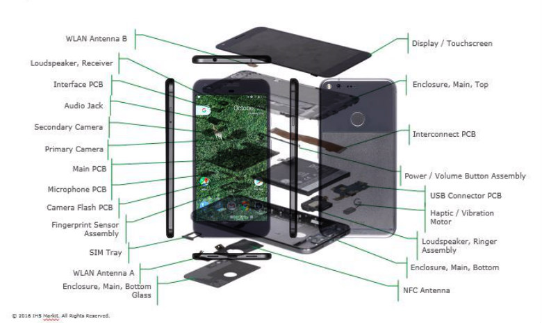 Rengeteg alkotóelemből áll a Pixel XL is, de nem kirívó az alkatrészmennyiség. [+]