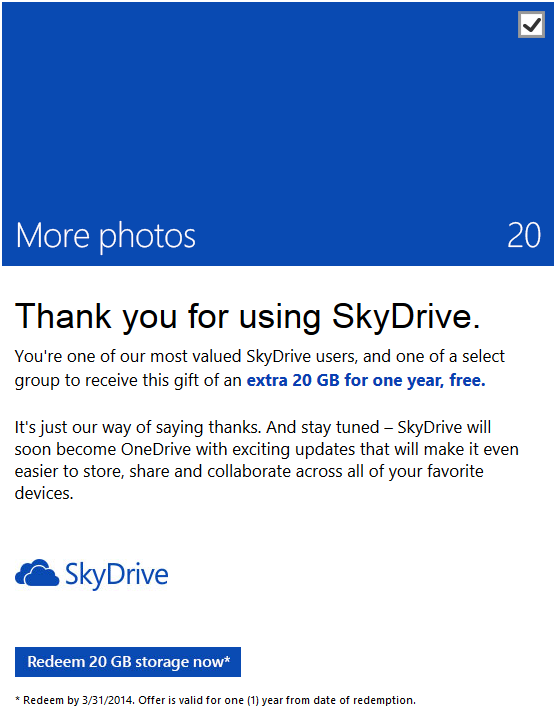 Az okostelefon felhasználok számára ma már teljesen természetes, hogy bizonyos mennyiségű ingyenes online tárterülettel is gazdálkodhatnak, mely a biztonsági mentéseken túl képek, videók és zenék tárolására illetve streaming elérésére is lehetőséget teremt. A Microsoft esetén ezen tárhely korábban SkyDrive néven volt ismert, mostantól azonban a márkanevek egyszerűsítésével és összevonásával a OneDrive nevet viseli. A WMPoweruser értesülései szerint a Microsoft a hűséges felhasználóinak 20 GB extra tárhelyet is ajándékoz egy évre, mely egyébként csak felárért lenne elérhető.