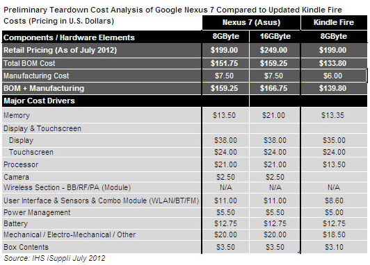 Az IHS iSuppli nemrég górcső alá vette az ASUS és Google első közös táblagépét és arra a megállapításra jutott, hogy az alapanyaggal kapcsolatos korábbi becslések kissé túlzóak voltak. A nettó 199 dolláros változat teljes anyag- és összeszerelési költsége valahol 151,75 dollár körül alakulhat, vagyis nagyjából 18 dollárral kerül többe mint a Kindle Fire. Az 1280x800 képpontos IPS megjelenítő 38 dolláros ára 3 dollárnyi többletkiadást jelent, a kamera újabb 2,5 dollárt visz el, mely mellett a fejlettebb szenzorok, a négymagos Tegra 3 processzor és az NFC modul is rátesz egy lapáttal az előállítási költségekre. Fontos megjegyezni azonban, hogy a 249 dolláros, 16 GB-os változat előállítási költsége mindössze 7,5 dollárral magasabb, vagyis a gyártó számára 42,5 dollárral magasabb hasznot jelent. A microSDHC foglalat elhagyása tehát nem véletlen. A Google az Apple stratégiáját követve az indokoltnál jóval magasabb díjakat számol fel a megnövelt belső memóriáért, miközben valójában „filléres” komponensekből építkezik.