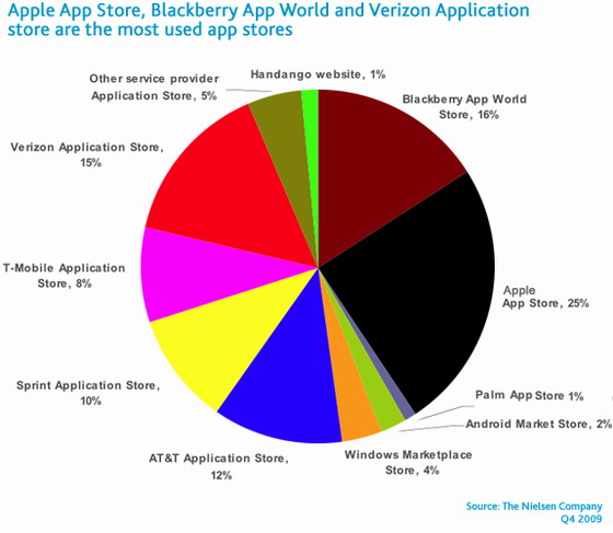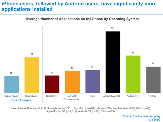 A Nielsen által az Egyesült Államokban végzett felmérés szerint az App Store vásárlói tűnnek a leginkább elégedettnek a rendszer kezelőfelületével, az alkalmazások választékával és az árazással, éppen ezért az Apple iPhone tulajdonosai töltik le a legtöbb ingyenes és prémium alkalmazást is. A felmérés szerint a Google által üzemeltetett Android Market is igen jól szerepel, ám érdekes módon a ranglista következő négy helyét a szolgátlatói online boltok, sorrendben a T-Mobile Application Store, Sprint Application Store, AT&T Application Store és a Verizon Application Store követi. A BlackBerry App World, Windows Marketplace és Palm App Store, sem kínálat sem pedig kezelőfelület terén nem tűnik túlságosan kiemelkedőnek. A Nielsen felmérésében egyébként azért nem szerepel az Ovi Store, mert az Egyesült Államokban a Nokia piaci részesedése túlságosan is alacsony, így nincs értelme külön is szerepeltetni.