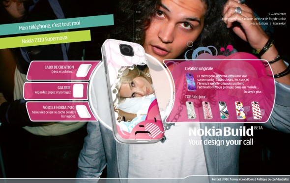 A Nokia 7310 Supernova már önmagában sem nevezhető éppen visszafogott mobilnak, ám aki az eredeti dizájnt túlságosan unalmasnak tartja, az a francia Nokia oldalán olyat tervezhet magának amilyet csak akar. Akár előre elkészített sablonokból, akár saját feltöltött fotók felhasználásával is megtervezhető a Nokia 7310 hátlapja, így egészen biztosra vehető, hogy senki másnak nem lesz hasonló mobilja. Az Nokia Build koncepció egyelőre még csak tesztüzemben működik, de valószínűleg ha Franciaországban jól szerepel, akkor később máshol is elérhetővé válhat a saját mobilok tervezésének lehetősége.