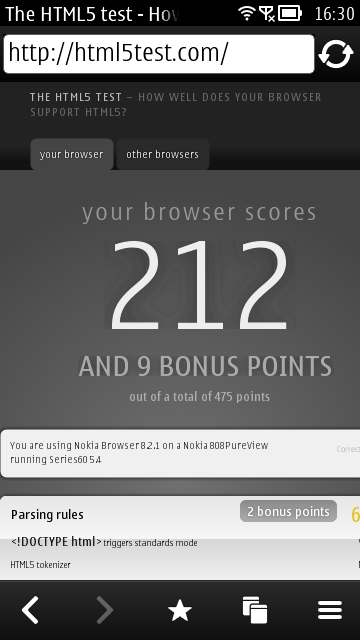 Úgy tűnik, hogy a finn gyártó igencsak ráfeküdt a Symbian platform böngészőjének felturbózására, hiszen a HTLM5 kompatibilitási tesztekben felbukkant Nokia Belle FP 2 (Series 60 5.5) összesen 242 + 9 bónusz pontot kapott. A PureView 808 fedélzetén debütáló Belle FP1 ezzel ellentétben csupán 212 + 9, az alap Symbian Belle pedig csupán 157 + 7 pontot ért el. Csak összehasonlításul: az Android 2.3 Gingerbread ugyanezen tesztekben 181 + 1, az Android 4.0 Ice Cream Sandwich pedig 256 + 3 pontot ért el, míg a Windows Phone 7.5 Mango csupán 141 + 5 pontot kapott. Az alap mobiltelefonos böngészők királya továbbra is a Mobile Safari marad, melynek iOS 5-alapú változata 305 + 9 pontot kapott.