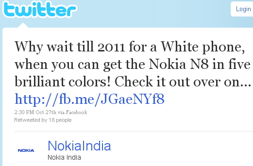 A prémium mobilok piacát uraló Apple azonban úgy tűnik, hogy nagyon csípi a Nokia szemét, így aztán minden apró hibás lépést igyekszik maximálisan meglovagolni. A finn gyártó indiai Twitter-oldalán található „miért várnál 2011-ig egy fehér mobilra, amikor a Nokia N8 öt briliáns színben is elérhető” felirat egyértelműen a fehér iPhone 4 gyártási nehézségein élcelődik, noha a két modell célközönsége nem is azonos, ráadásul az április végén bemutatott Nseries csúcsmodell is több mint fél éves késéssel vált elérhetővé.