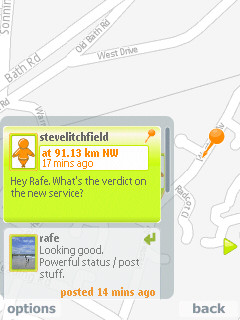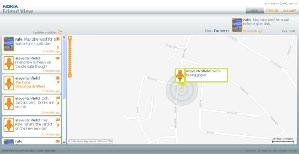 Friends View, allowing current geo-location sharing with friends on Nokia Series 60 handsets, is available on the Nokia Beta Labs site. The current location can be updated automatically based on the handset's built-in GPS data, or based on cell information if no GPS is present, and the current location can also be set manually. The service is also available via a web interface. Besides being able to share their current location, users can also set blog-like messages, which can be accessed by friends. The application helps users plan spontaneous meetings with friends, as nearby contacts are easy to find, and the status messages let others know if someone is available or not. The Friends View application is available from Nokia Beta Labs at this link. The web interface is available through Nokia Ovi.