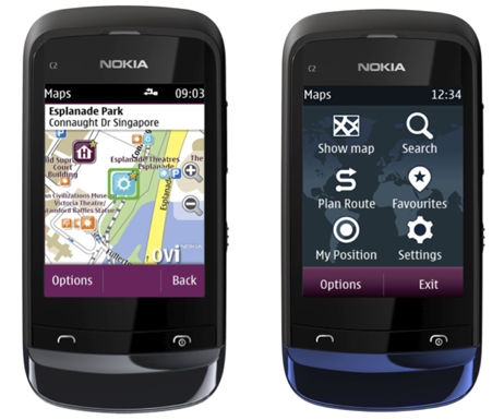 Hivatalosan is leleplezésre került a Nokia Maps térképes szoftver Series 40 alapú hagyományos mobiltelefonokra szánt változata, mely beépített GPS hiányában a GSM adótornyok jelei alapján is képes meghatározni a készülék pillanatnyi tartózkodási helyét, ám ez kisebb adatforgalmat igényel. Maga a szoftver hangos navigációra egyelőre nem képes, egészen pontosan ilyen tudás egyelőre nem került említésre, noha korábban a Nokia 2710-es már rendelkezett ezen szolgáltatással. A Nokia Maps új változata a C2-02, C2-03 és C2-06 modelleken előre telepítve is elérhető lesz, méghozzá a regionális térképekkel együtt, vagyis a konkurens modelleken elérhető Googla Maps integrációtól eltérően a Nokia készülékei adatforgalom nélkül, közvetlenül az alapcsomagból kiemelve is képesek a térképek böngészésére, címkeresésre, illetve útvonalak tervezése és követésére. A Nokia Maps for Series 40 ezen túlmenően az útvonalak és helyszínek megosztására is alkalmas, méghozzá rövid szöveges üzenetekben, illetve az offline térképek frissítésére is lehetőség nyílik.