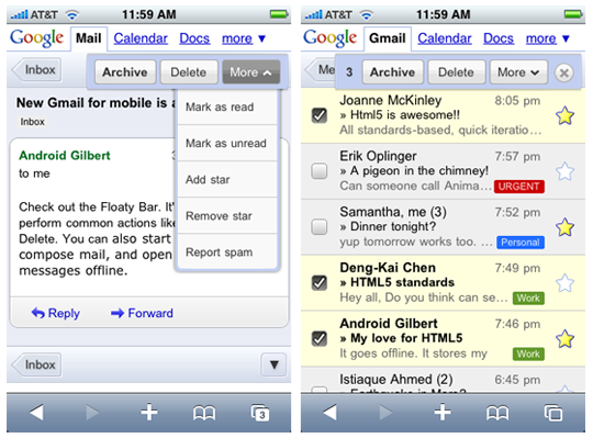 A Google frissítette a GMail mobile online elérhető változatát, mely számos új funkcióval kecsegtet az Apple iPhone, iPod Touch és Android modellek felhasználói számára. Az új funkciók kiaknázásához nincs szükség szoftver telepítésére, ugyanis a kód kizárólag a beépített böngésző HTML5 támogatását, valamint Apple modellek esetén az SQLite, míg Android mobiloknál a Gears adatbázis-támogatást használja. Az új GMail mobile oldal már offline módban is képes leveleket szerkeszteni, valamint a korábban megjelenített levelek is megtekinthetők, ha azok még az átmeneti háttértárban vannak. Az offline üzemmód bevezetése mellett a mobil variáns kezelőfelülete is sokat fejlődött, melyben a lebegő menük alkalmazása lehetővé tette, hogy a legfontosabb funkciók görgetés során is a képernyőn maradjanak. Az új szolgáltatások kiaknázáshoz elegendő ellátogatni a GMail oldalára.