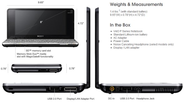 A komoly pénzügyi nehézségekkel küzdő Sony a CES alkalmával mutatta be a sokat pletykált mini noteszét, mely méretét tekintve egy netbooknál sokkal kisebb, ám tudása terén igazi óriás. A mindössze 245,1x119,9x19,8 milliméteres és akár 635 grammos Lifestyle PC rendkívül kompakt méretét az exta széles, 8 hüvelykes, 1600x768 képpontos kijelzővel és a hagyományos touchpad elhagyásával érte el a gyártó. Optikai meghajtó természetesen nincs a jövevényben, adott viszont az 1,33-es GHz Intel Atom processzor, 2 GB RAM, 60 GB merevlemez vagy 64 illetve 128 GB SSD, beépített 3G átviteli képesség, GPS vevő adatátvitelv nem igénylő komplett navigációs szoftverrel, WLAN, Bluetooth és LAN modul, MSPro/SD kártyahely, webkamera, mikrofon, hangszóró és egy Windows Vista Home operációs rendszer. A parányi készülék egy feltöltéssel 4 óra működésre képes, de tartozékként 8 óra üzemidőt kínáló akkumulátor is elérhető. A 60 GB-os merevlemezzel szerelt 680 grammos notesz 900 dollárért, azaz 184.000 forintért, míg a 64 illetve 128 GB-os SSD-vel szerelt 635 grammos változat 1.200 és 1.500 dollárért, azaz 246.000 és 307.000 forintért lesz elérhető.