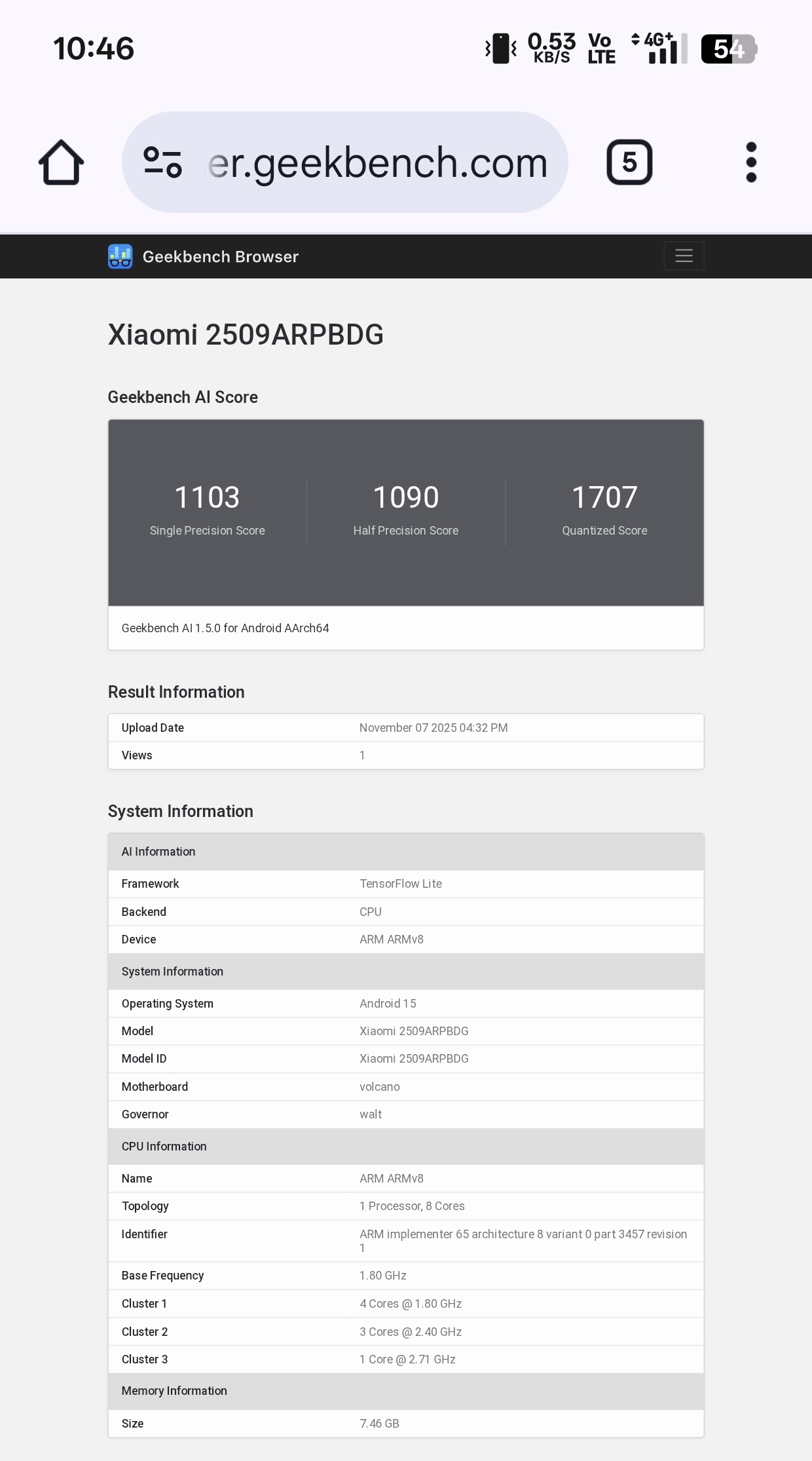 A Poco Pad M1-es táblagép eredménye a Geekbench AI teszten (forrás: Twitter) [+]