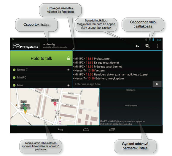 A PTTSystems mai sajtótájékoztatóján mutatta be azt a megoldást, ami a Push-To-Talk szolgáltatás továbbfejlesztésének tekinthető, s immáron okostelefonokon is működik. Az Android platformra megírt szoftver olyan hasznos funkcióval bővíti a készülékek tudását, ami kiválthatja az URH és a Tetra rendszereket is, főleg kisvállalati környezetben, de a cég képes speciális igényeknek is megfelelni, első partnereik között a Volánbusz is megtalálható.