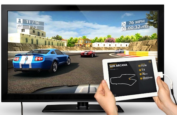 Már az iPad 2 bejelentésekor is egyértelműnek tűnt, hogy az Apple egyre nagyobb szeletet szeretne kihasítani a játékkonzolok piacából is, hiszen a készülékben található kétmagos processzor, az előző generációhoz képest esetenként kilencszeres sebességgel kecsegtető grafikus gyorsító, valamint a digitális iránytű, giroszkóp és gyorsulásmérő, illetve a teljes felbontású HD kimenet is a játékok új generációja számára jelenthet táptalajt. Az alant látható Real Racing 2 HD az elsők között aknázza ki a 1080p felbontású videótükrözésben rejlő lehetőségeket, mely másodpercenként akár 30 képkocka megjelenítését is lehetővé teszi nagyméretű televíziókon is. A játék további érdekessége, hogy a vezérléshez az iPad 2 valamennyi szenzorát kiaknázza, miközben a beépített kijelzőn a legszükségesebb információk is megjelenítésre kerülnek. A külső HDMI kábel leválasztásakor a játék automatikusan felfüggesztésre kerül, így annak egyszerű felfüggesztésére is lehetőség nyílik.