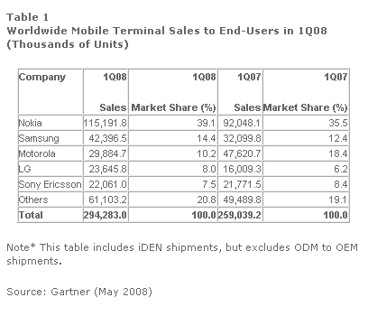 According to the report of market analyst Gartner, in the first quarter of 2008, 294.3 million cell phones have been sold, which is a 13.6% growth compared to the same period last year, but in Europe, where the market is heavily overstocked, there has been a 16.4% decrease. Nokia, world's largest manufacturer, is still a leader with a great advantage, as they have sold 115.2 million devices, which means a 39.1% market share. According to the market analyst the key to the manufacturer's success is its huge portfolio, which provides a number of alternatives for both richer regions and those in development. Although the Finnish manufacturer is powerful in all segments of the market, they will need to introduce new technologies and a smoother design due to the tense competition in the top segment.