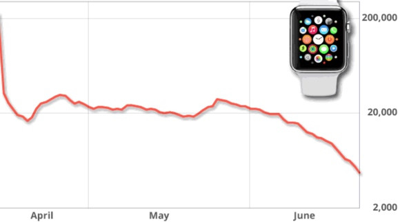 A MarketWatch által kiadott jelentés szerint az Apple Watch eladásai 90 százalékot estek vissza az utóbbi hetekben. Az adatokat a jól ismert Slice Intelligence gyűjtötte össze és bocsátotta rendelkezésre. A riport szerint az almás vállalat naponta már csak kevesebb mint 20 ezer darab órát értékesít, holott korábban egy nap alatt ennek többszöröse talált gazdára, és az áprilisi piacra kerülése óta eddig másfél millió ilyen okoskütyü fogyott.