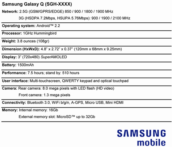 Számos újabb részlet látott napvilágot a már sokat pletykált Samsung Galaxy Q készülékkel kapcsolatban, mely méretes érintőkijelzőt és teljes QWERTY gombsort kínál majd rendkívül vékony kivitelben. A kiszivárgott adatlap szerint a jövevény 3 hüvelykes, 720x480 képpontos Super AM-OLED érintőkijelzőt, HD videók felvételére alkalmas 8 megapixeles fő és 1,3 megapixeles másodlagos kamerát, GPS, WLAN (802.11b/g/n) és Bluetooth 3.0 modult, háromnormás HSPA modult, 1 Hzz-es Hummingbird processzort, 16 GB belső memóriát, HDMI csatlakozót és 1.500 mAh kapacitású akkumulátort kapott. A 120x68x9,25 milliméteres és 108 grammos Samsung Galaxy Q piaci debütálásának időpontja egyelőre nem ismert.