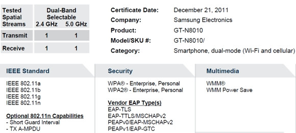 A WiFi Alliance adatbázisában bukkant fel először a Samsung GT-8010 sorszámú készülék, mely a szeptemberben leleplezett GT-N7000 Galaxy Note közvetlen utódja lehet. A készülék műszaki paramétereiről egyelőre nincs információ, de annyi már bizonyos, hogy 2,4 és 5 GHz-es tartományban is üzemelő kétnormás WLAN (802.11a/b/g/n) modult kapott. Az 5,3 hüvelykes, 800x1280 képpontos kapacitív multitouch érintőkijelzővel szerelt, Android 4.0 Ice Cream Sandwich alapokon nyugvó Galaxy Note „táblamobil” utódjának létezéséről több forrásból is lehetett már hallani,ám pontos specifikáció vagy kémfotó ezidáig nem szivárgott ki.