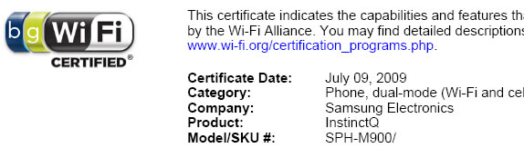The name of Samsung InstinctQ M900 has first appeared on the WiFi Alliance website, on the compatibility certificate, so currently there are no spy pictures or detailed specifications available. Based on current information the only things sure are that the phone uses the Android operating system and that it supports WLAN, besides the fact that this version could be launched by Sprint in America, so GSM and HSDPA support are not very probable.