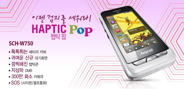 While only one of the two "new-generation" Finnish touchscreen models are currently available, Samsung has practically a touchscreen phone in all market segments, so you can find smartphones and simple phones with their own Flash user interface as well. Samsung W750 Haptic Pop, pictured below, is a fashion phone, at least the nine, colored back panels that come with the phone suggest this. The phone, made exclusively for South Korea, has a 3 megapixel camera, a 3.2", 432 x 240 pixels large touchscreen display, a T-DMB TV receiver and a loud alarm for scaring attackers. There is no official information regarding the handset's price and launch date.