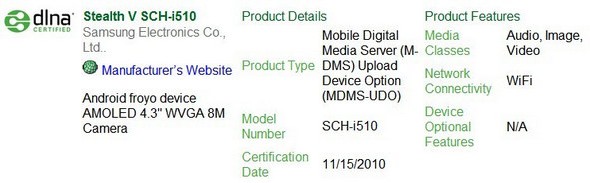 Rövidesen hivatalosan is bemutatásra kerülhet a DLNA szövetség oldala által leleplezett Android 2.2 alapú Samsung Stealth V. A jövevény pontos specifikációja egyelőre nem ismert, de a 4,3 hüvelykes kapacitív multitouch érintőkijelző, a 720p felbontású HD anyagok rögzítésre alkalmas 8 megapixeles kamera, és WLAN (802.11b/g/n) modul jelenléte már biztosnak tűnik. Az SCH-I510 sorszámú modell a CDMA hálózati támogatása miatt valószínűleg csak az amerikai Verizon Wireless kínálatában lesz elérhető, de hasonló variánsok világszerte elérhetővé válhatnak.