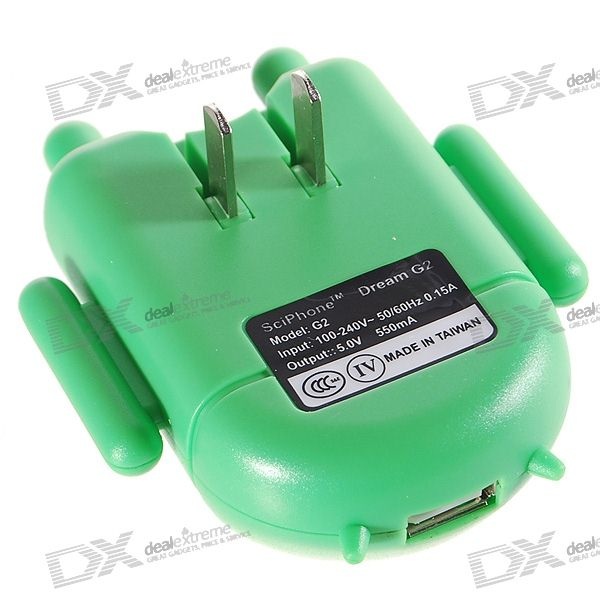 Korábban már beszámoltunk róla, hogy a kínai SciPhone Dream G2 a piac legellentmondásosabb ajánlataként az ingyenes Android operációs rendszer használata helyett, időt és pénzt nem kímélve, kifejlesztett egy saját megoldást, mely a Google szoftverének viszonylag pontos reprodukciója. A 150 dolláros készülék önmagában tehát nem okostelefon, csak egy tipikus másolat, ám a töltő mindenképp említést érdemel. Az USB porttal rendelkező töltő különlegessége nem a hatékony működésben és nem is a minimális készenléti áramfelvételben rejlik, hanem külső vonásaival vonja magára a figyelmet, mely a Google nyílt operációs rendszerének szimbólumát testesíti meg.