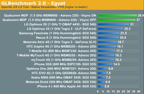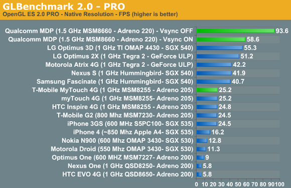 A QSD8255-ben egy Adreno 205 kódnévre hallgató grafikus gyorsítóchip dolgozik, mely - nem meglepő módon - az elődben lévő Adreno 200 továbbfejlesztett változata. A Scorpionnal ellentétben ennél a chipnél nem csak a Qualcomm munkájáról van szó, az Adreno kifejlesztésében komoly szerepet vállalt az AMD is. A lenti képeken jól látszik, hogy ez a megoldás erőteljesebb, mint az iPhone 4-ben működő Apple A4 processzor + PowerVR SGX535 duó, az NVIDIA Tegra 2-ben lévő ultra alacsony fogyasztású GeForce és a PowerVR SGX540-es grafikus gyorsítók viszont lenyomják. Teljesítményére ettől függetlenül nem lehet panasz.