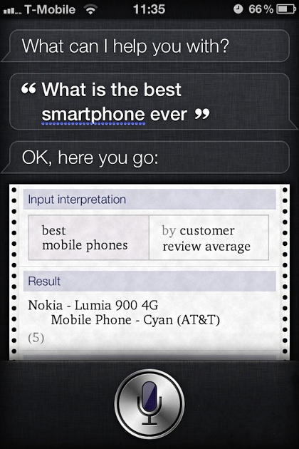 A Lumia 900 rendkívül pozitív fogadtatását mi sem jelzi jobban, mint a vásárlók elismerése, melyek alapján az Amazon és a Wolfram Alpha is a legjobb okostelefonként tartja számon a Nokia üdvöskéjét. Az Amazon oldalán elérhető vásárlói értékelések szerint a Windows Phone-alapú készülék kezelőfelülete, szolgáltatásai és sebessége is maximálisan megfelel az elvárásoknak, hiszen egy hónappal a piaci bevezetést követően még mindig öt csillagos minősítéssel büszkélkedhet. Siri, az Apple személyi asszisztense szintén ugyanezt a választ adja a legjobb telefon utáni érdeklődésre, mely elsőre kicsit furcsának tűnhet, de mivel a szolgáltatás a Wolfram Alpha adatbázisából dolgozik, így egyáltalán nem meglepő az eredmény.