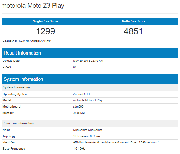 A Motorola Moto Z3 Play minden valószínűség szerint június 6-án kerül bemutatásra, már ismerni vélt specifikációval. Az XDA Developers információi látszólag javarészt továbbra is stimmelnek, leszámítva a processzort, mert az a Geekbench szerint nem a Snapdragon 636, hanem a 660-as szett, viszont szintén 4 GB operatív memóriával és Android 8.1-es rendszerrel.