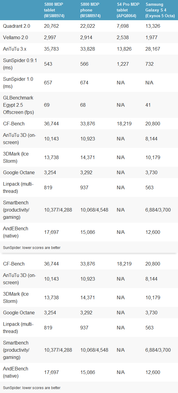 Az Engadget szerkesztősége azon szerencsések közé tartozik, akik elsőként próbálhatták ki a Qualcomm legújabb processzora köré épített MDP tesztplatformját, mely a Snapdragon 800 erejének demonstrálására hivatott. Az alant látható tesztekből egyértelműen kitűnik, hogy a Tegra 4-től eltekintve a Qualcomm megoldása gyakorlatilag mindent lesöpör az asztalról, ám néhány tesztben az NVDIA üdvöskéje tűnik erősebbnek. A nyers erő persze még nem minden, hiszen hordozható eszközökről lévén szó, van még egy igen fontos paraméter: ez pedig a fogyasztás. Nem csak az számít, hogy a processzor maximális terhelés mellett mekkora áramot vesz fel, hanem az is, hogy mennyire lehet leszorítani az energiaéhségét készenléti üzemmódban. Az ARM processzorok és mobil grafikus gyorsítók villámgyors fejlődésével a hordozható eszközök számítási teljesítménye az elmúlt évek során megsokszorozódott és ma már a belépőszintű laptopokkal is könnyedén felveszik a versenyt.