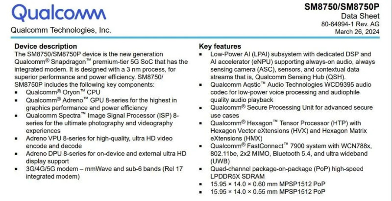 Októberben mutatkozhat be a következő generációs MediaTek és Qualcomm csúcslapka, és bár mindkettőről rengeteget lehetett hallani, most érkezett az eddigi legkézzelfoghatóbb információ a Snapdragon 8 Gen 4 kapcsán, bár az eddigi Geekbench eredmények is beszédesek. Az alább látható adatlap hivatalosnak tűnik, ám március 26-ai dátumozás is aláhúzza, hogy nem a publikumnak, inkább belső használatra és a partnereknek szánták az összefoglalót. A 3 nm-es node-on készülő lapka legfőbb érdekessége az ARM Cortex processzormagokat váltó Oryon egységek lesznek 35%-os erősítést ígérve egyszálas és 30%-kal jobb eredményeket többszálas CPU tesztben.
