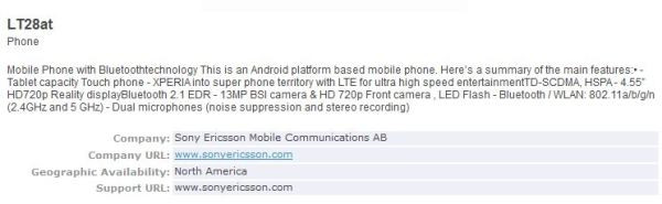 A Bluetooth SIG oldalán bukkant fel a Sony Ericsson január 9-én, a Consumer Electronics Show alkalmával leleplezésre kerülő csúcsmobilja, mely műszaki paraméterei alapján egyértelműen a legfelső szegmensben landolhat. A 4,55 hüvelykes, 720x1280 képpontos kapacitív multitouch érintőkijelzővel, 13 megapixeles fő és 720p HD videohívások lebonyolítására alkalmas előlapi kamerával, valamint 4G LTE modemmel is felvértezett LT26at nem összetévesztendő a hasonló sorszámú, ám „csupán” 4,3 hüvelykes megjelenítővel szerelt LT26i „Nozomi” változattal, mely az Egyesült Államokon kívül lesz csak elérhető. Az amerikai AT&T Wireless kínálatában megjelenő Sony Ericsson LT26at várható ára egyelőre nem ismert.