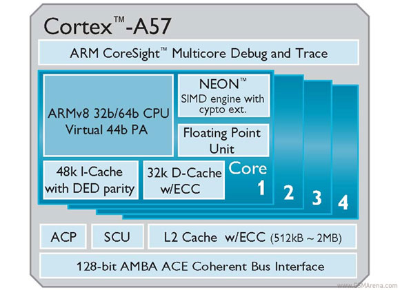 Az ARM és a TSMC közleménye szerint elkészült a világ első Cortex-A57 magokból építkező lapkája, mely így sorozatgyártásra kész megoldásként licencelhető lesz a partnerek számára is. A 16 nanométeres FinFET eljárással készülő központi vezérlőegységben a tranzisztorok továbbra is 20 nanométeren kerülnek kialakításra, de a gyártástechnológia előnyei így is érezhetőek. Az ARM állítása szerint az új megoldás a Cortex-A15 magok számítási teljesítményének háromszorosával bír azonos fogyasztás mellett, illetve az azonos számítási sebesség elérése ötödannyi energiával is lehetséges. Az új megoldás várhatóan táblagépekben, számítógépekben és szerverekben is elérhető lesz, bár azt egyelőre nem tudni pontosan, hogy ezek mikor kerülnek piacra.
