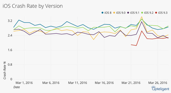 A korábbi iOS szoftvereket megfigyelve a grafikonon jól látható, hogy mind a 8-as főverzió, mind a 9-es első kiadása jóval instabilabb volt, százalékban kifejezve 3,2-es értéket mértek az analitikusok. Természetesen az iOS 9.3 sem hibátlan, korábban például meg kellett vonni a telepítési lehetőséget a régebbi készülékektől, mivel aktiválási problémák léptek fel. Van még egyébként egy web link bug is, ami a Booking.com-hoz tartozó applikációkat érinti, ezt az Apple még mindig nem orvosolta, bár állítólag már dolgoznak rajta.