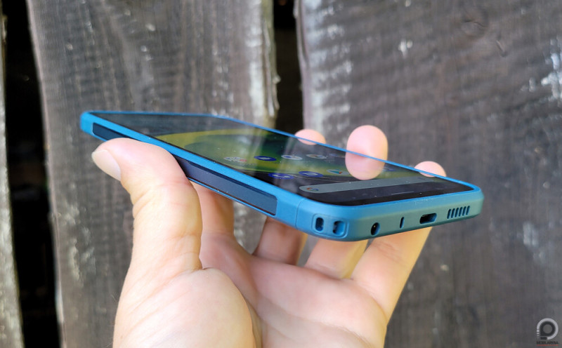 Az egyik ilyen hasonlóság a 6,67 inches IPS kijelző, ami bár paramétereit tekintve ugyanaz, mint a testvérmodelleken, fénysűrűsége valamivel magasabb. Az ujjlenyomat-olvasó az oldalsó gombban üldögél, a telefon tetején pedig egy pirosra festett extra gombot találunk majd, ez a segélyhívó gomb, de más funkcióra is lehet paraméterezni. Ellentétben a bal oldalra tett Google-gombbal, aminek a funkcióját nem lehet megváltoztatni.
