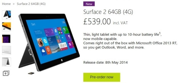Sokan valószínűleg jobban örülnének egy ajándék billentyűzetes takarónak, de ezen opciót a Microsoft tavaly is csupán a visszamaradt raktárkészletek felszámolásakor vetette be. A 275 × 173 × 8,9 milliméteres és 685 grammos Surface 2 LTE a Windows 8.1 RT változata köré épül, mely egyben azt is jelenti, hogy teljes értékű PC alkalmazások futtatását nem teszi lehetővé. Cserébe viszont az operációs rendszer teljes változatától eltérően az ARM architektúrára fejlesztett változat az Office RT irodai csomagot is előre telepítve tartalmazza. A 10,6 hüvelykes, 1920 × 1080 képpontos kijelzővel szerelt készülék további érdekessége, hogy a fémes burkolatának hátoldalán egy beépített asztali állvány is található, mely mellett 5 megapixeles hátoldali és 3,5 megapixeles előlapi kamerával, 1,7 GHz-es négymagos Nvidia Tegra 4 processzorral 2 GB RAM-mal, 64 GB belső memóriával és nagyjából 10 órányi videolejátszást biztosító akkumulátorral is rendelkezik.