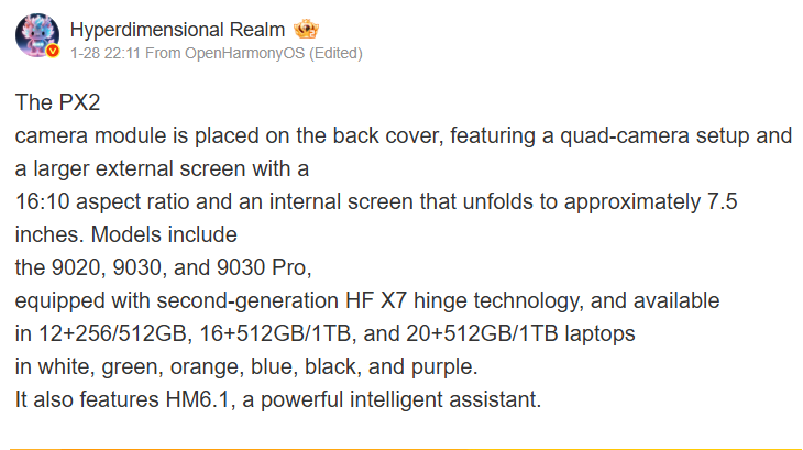 A hardveres részletek között négykamerás hátlapi rendszert, áttervezett zsanért, illetve többféle lapkára épülő variánst emlegetnek: Kirin 9020, Kirin 9030 és Kirin 9030 Pro is szóba került. A memória és a tárhely esetében akár 20 GB RAM és 1 TB tárhely is esélyes, szoftverfronton pedig HarmonyOS 6.1-et, valamint egy integrált AI asszisztenst várhatunk. A színek terén kék, fekete, zöld, narancs, lila és fehér opciókról írnak. Érdekesség, hogy az informátor eredetileg 200 megapixeles főkamerát is említett, ezt azonban később törölte a bejegyzésből, így ezt érdemes fenntartásokkal kezelni.