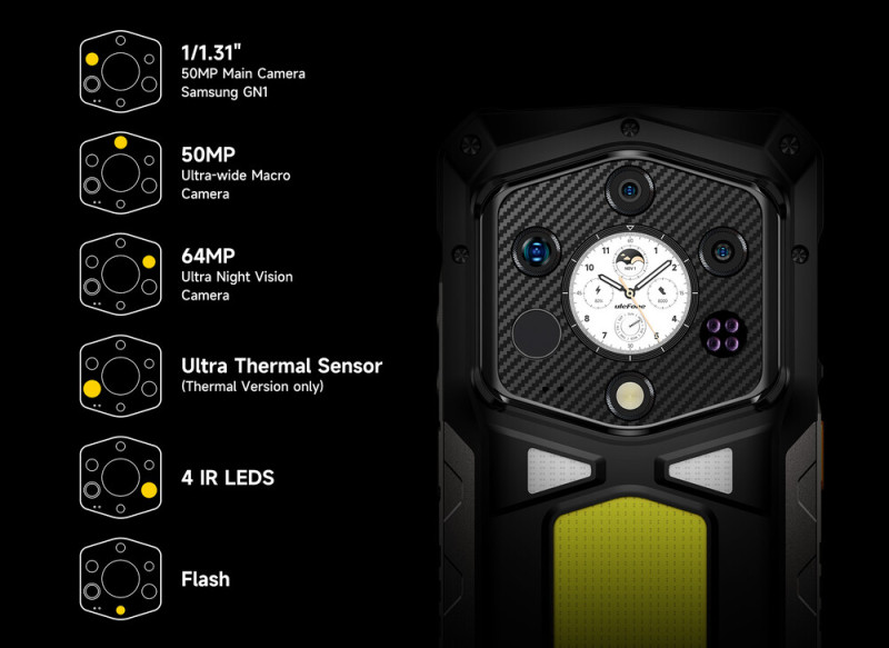 A specifikáció ezt leszámítva megegyezik, mindkét készülék a Dimensity 7400-zal dolgozik, 21200 mAh-s telepet kínál 120 wattos töltésteljesítménnyel, a hátlapon pedig nem csak egy 64 megapixeles éjjellátó kamera, egy 50 megapixeles, 1/1,31"-es főkamera és egy 50 megapixeles ultraszéles látószögű kapott helyet, de egy 1000 lumenes LED zseblámpa is segélykérő funkcióval.