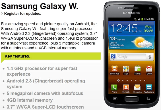 Az Egyesült Királyságban már a jövő hónapban piacra kerül a Samsung Galaxy Y, Y Pro és M Pro készülékekkel együtt leleplezett Galaxy W, mely a brit Three kínálatában várhatóan az ingyen elvihető modellek között landol. A Galaxy S II visszafogottabb változatának is tekinthető jövevény 3,7 hüvelykes, 480x800 képpontos S-LCD érintőkijelzőt, LED villanóval ellátott 5 megapixeles fő és VGA másodlagos kamerát, 14,4/5,76 megabites HSPA átviteli képességet, GPS, WLAN és Bluetooth 3.0 modult, 1,4 GHz-es processzort, 4 GB belső memóriát és 1500 mAh kapacitású akkumulátort kapott. A 115,5x59,8x11,5 milliméteres Galaxy W a következő hónapok során valószínűleg hazánkban is piacra kerül, de várható árat egyelőre nem közölt a gyártó.