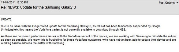 Nem kívánatos mellékhatások miatt került felfüggesztésre a Samsung Galaxy S Andorid 2.3 Gingerbread frissítésének elérhetősége, mely hátterében az angol Vodafone szerint a Google áll. A meg nem nevezett hibajelenségek nem minden készüléket érintenek, de a keresőóriás ennek ellenére a folyamat teljes kivizsgálása mellett döntött. A brit Vodafone szóvivője szerint a cégcsoport által forgalmazott készülékek mentesek a frissítési nehézségektől, így a Gingerbread frissítés rövidesen újra elérhetővé válhat. A 122,4x64,2x9,9 milliméteres és 119 grammos Samsung Galaxy S 4 hüvelykes, 480x800 képpontos Super AMOLED érintőkijelzőt, 720p felbontású HD anyagok rögzítésére alkalmas 5 megapixeles kamerát, GPS, WLAN (802.11b/g/n) és Bluetooth 3.0 modult, 7,2/5,76 megabites HSPA átviteli képességet, 1 GHz-es ARM Cortex-A8 alapú Hummingbird processzort, valamint 3G hálózatokon 6, GSM hálózatokon pedig 11,5 órányi beszélgetési időt biztosító 1500 mAh kapacitású akkumulátort kapott.