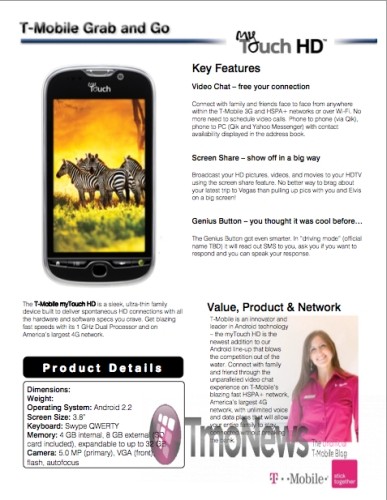 Egyelőre nem tudni, hogy a TmoNews által publikált „belső dokumentum” mennyire valódi, de az oldal állítása szerint megbízható forrásból származik. A kiszivárgott adatlap szerint a myTouch HD az Egyesült Államok legnagyobb 4G hálózatán fog debütálni, mely már csak azért is furcsa, mert a készülék által támogatott HSPA+ átvitel a 3G alapú megoldások továbbfejlesztett változata csupán. A készülék egyébként 3,8 hüvelykes kapacitív multitouch érintőkijelzőt, 5 megapixeles fő és VGA felbontású másodlagos kamerát, 4 GB belső memóriát, 8 GB-os előre telepített memóriakártyát, valamint 1 GHz-es órajelen futó „két processzort” kapott, mely vagy az új kétmagos Snapdragon processzorra utal, vagy a grafikus gyorsító jelenlétére, melyet korábban a Nokia is másodlagos processzorként számolt. A T-Mobile myTouch HD piaci bevezetésének időpontja egyelőre nem ismert.