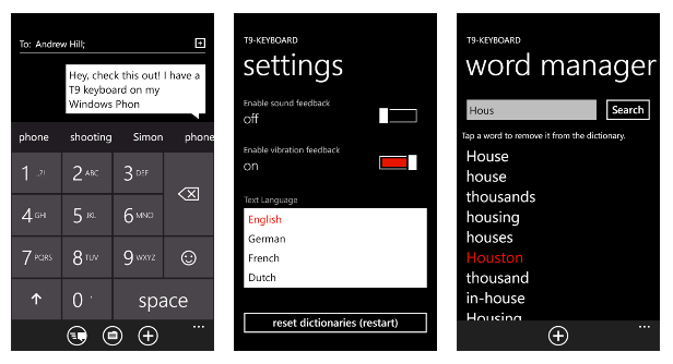 A virtuális QWERTY gombsor nem mindenki számára és nem minden helyzetben tűnik kényelmes választásnak, hiszen például egykezes használat során a hüvelykujjal elég nehéz eltalálni az apró billentyűket. A Windows Phone modellekre szánt T9 alkalmazás a hagyományos telefonos számbillentyűzet szótár-alapú bevitelének kényelmét hozza vissza, igaz, csupán a szöveges üzenetekhez. Az ingyen kipróbálható, majd 355 forintért minden szolgáltatásban aktiválható alkalmazás egyelőre csak angol, francia, holland és német nyelven használható, de rövidesen újabb szótárak érkezésére is számítani lehet. A nyelvenként legalább tízezres szókinccsel rendelkező szoftver természetesen saját szavakkal is bővíthető, mely révén alkalmazkodni tud az egyedi felhasználói igényekhez is.