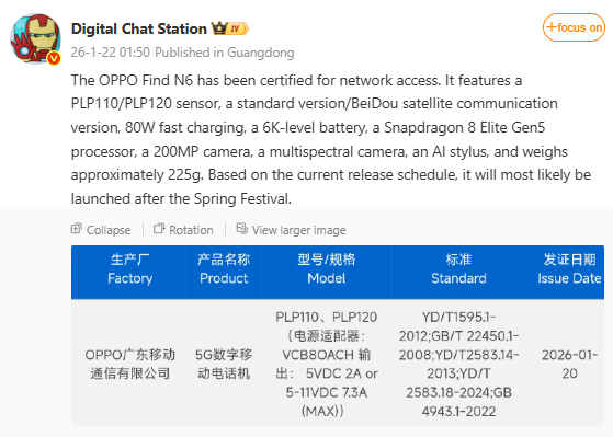 Úgy tűnik, az Oppo Find N6 Kínában már meg is kapta a szükséges tanúsítványokat, amelyek két helyi modellváltozatot is jegyeznek. Az alapmodell a PLP110 lehet, míg a PLP120 ennek BeiDou műholdas kapcsolattal kiegészített kiadása. A dokumentáció alapján a készülék támogatja a 80 wattos vezetékes gyorstöltést, a DigitalChatStation Weibo-bejegyzése szerint az akkumulátor kapacitása pedig legalább 6000 mAh, emellett pedig egy „AI stylus” (AI funkciókkal megtámogatott érintőtoll) is a csomag része lehet.