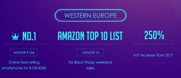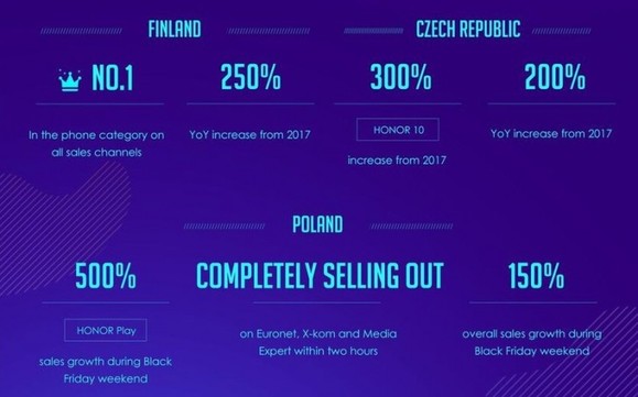 A skandináv térségben szintén jelentősen emelkedett a piaci jelenlét, Finnországban az első számú választás volt minden értékesítési csatornát figyelembe véve a mobil kategóriában, ami 250%-os javulást jelent. Csehországban a Honor 10 eladásai ugrottak 300%-kal a tavalyi megegyező időszakhoz képest, míg Lengyelországban az összes Honor modellt elkapkodták az online boltokból mindössze két óra alatt. A legkeresettebb készülék a Honor Play volt, ami a Black Friday során 500%-kal jobban fogyott, mint a bemutatás óta bármikor.