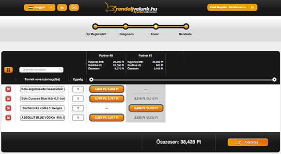 A történet rém egyszerűnek hangzik, pedig rengeteg szervezést és fejlesztést igényel. Van rengeteg nagykereskedés, akik különböző témákban utaznak, az Order-Taker rendszerén keresztül élelmiszert, italt, vegyiárut és irodaszert kínálhatnak. Amikor ezeket a sorokat írom, akkor nagyjából 80 beszállító van az adatbázisban. A másik oldalon pedig nyilvánvalóan ott ücsörögnek az ügyfelek, azok a cégek, kis- és középvállalkozások, éttermek, közértek, panziók, hotelek, akik nagy tételben rendelnének árucikkeket. Egy gyors regisztrációt követően, a céges adatok megadása után már rendelhetünk is, akár a webes felületet használjuk, akár az alkalmazást, a procedúra azzal indul, hogy a keresőbe begépeli az ember, hogy mire vágyik, én mondjuk a vodkával kezdtem, kaptam is egy sereg különböző kiszerelésű és márkájú italra ajánlatot. A kiválasztott termék kapcsán aztán látjuk egy táblázatban, hogy hol és mennyibe kerül, egy kattintás és máris a kosárban landol a megálmodott mennyiségű tétel. Ha a vodka mellé narancslé is szükséges, akkor lehet, hogy ezt egy másik beszállítónál fogjuk olcsóbban megtalálni, de egyetlen rendeléssel leadható mindkét igény.