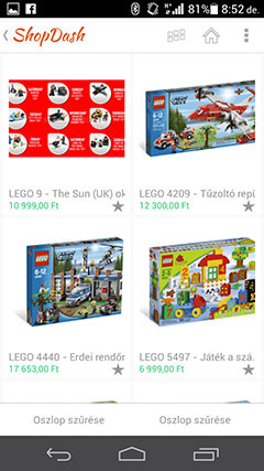 Ebben pedig a ShopDash elég ügyes. Belépés után egy trendi, kicsit flat stílusú felület fogadja a potenciális vásárlót, aki persze anonim módon is böngészgethet az árucikkek között, de vásárlás előtt regisztrálnia kell. A különböző kereskedők katalógusai egymás alatt helyezkednek el, ha belépünk, akkor két oszlopra bontva látjuk a termékeket, amelyek között oszloponként is szűrhetünk, ráadásul a két oszlop egymástól függetlenül is gördíthető. Ez elég jópofa megoldás, ha valakit zavar, akkor a felső részen található kis ikonnal átállíthatja úgy is a felületet, hogy az oszlopok egyszerre mozogjanak. Az árucikkekre kattintva kaphatunk nagy felbontású képet és további adatokat is, rögtön be lehet dobni a kosárba a terméket. Szúrópróba jelleggel megnézegettem, hogy az árak mennyire vannak elszállva, de azt tapasztaltam, hogy néha még kicsit olcsóbbak is a ShopDash kínálatában levő cuccok, mint amennyiért általában azokat meg lehet venni az ismertebb áruházakban.